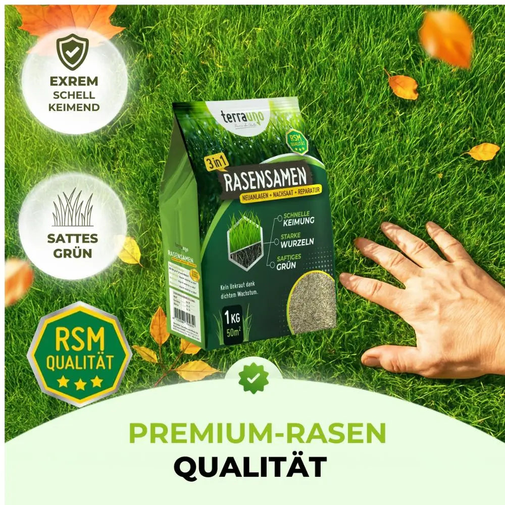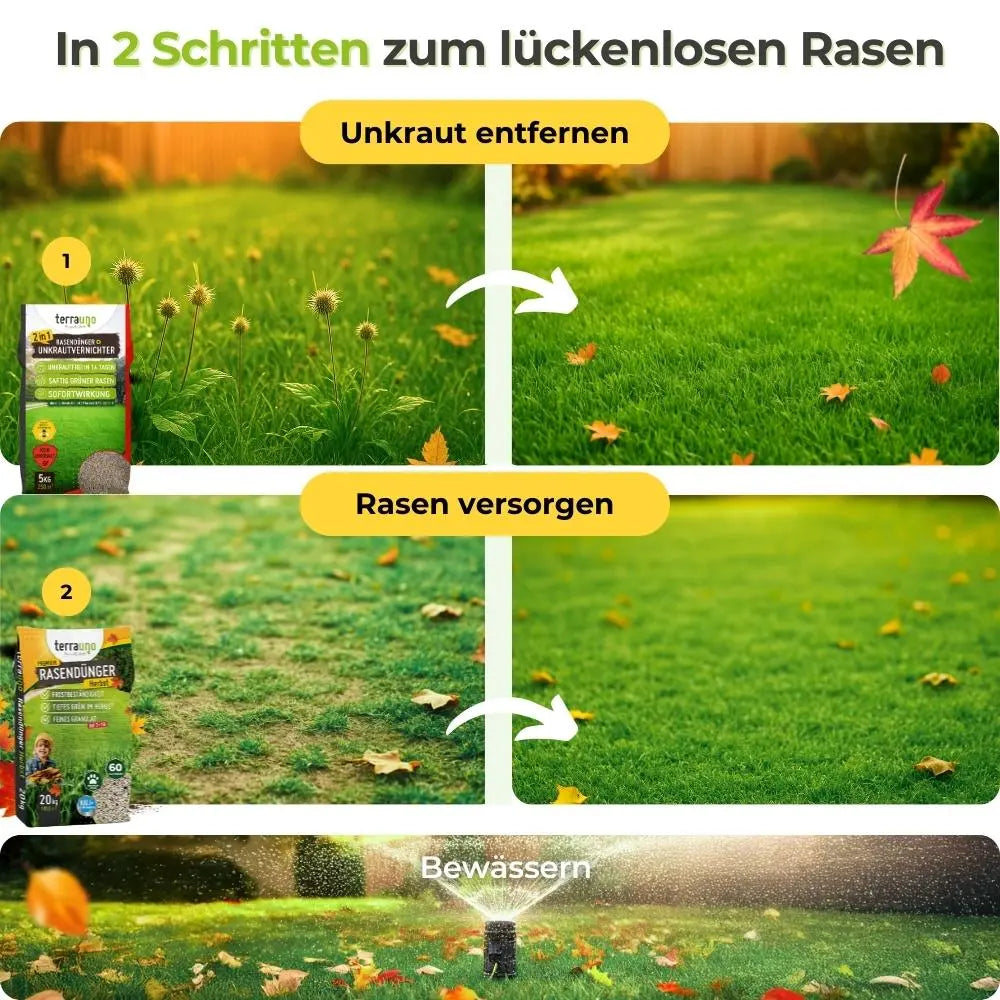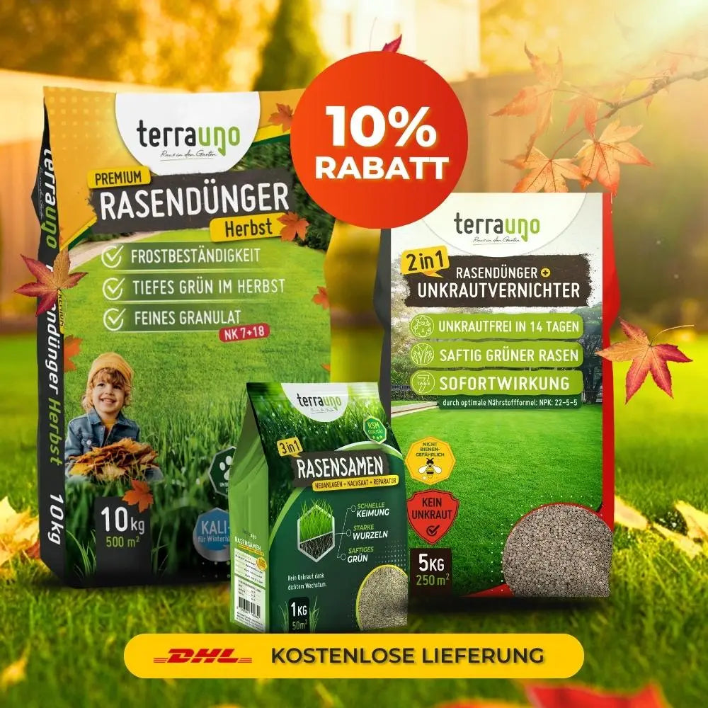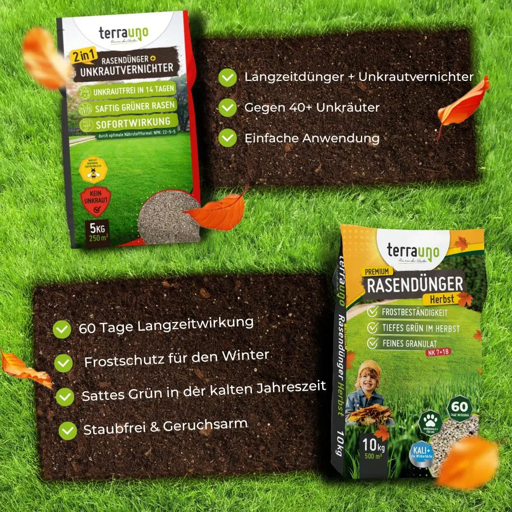 10 kg Herbstrasendünger + 5 kg Rasendünger mit Unkrautvernichter + 1 kg Rasensamen