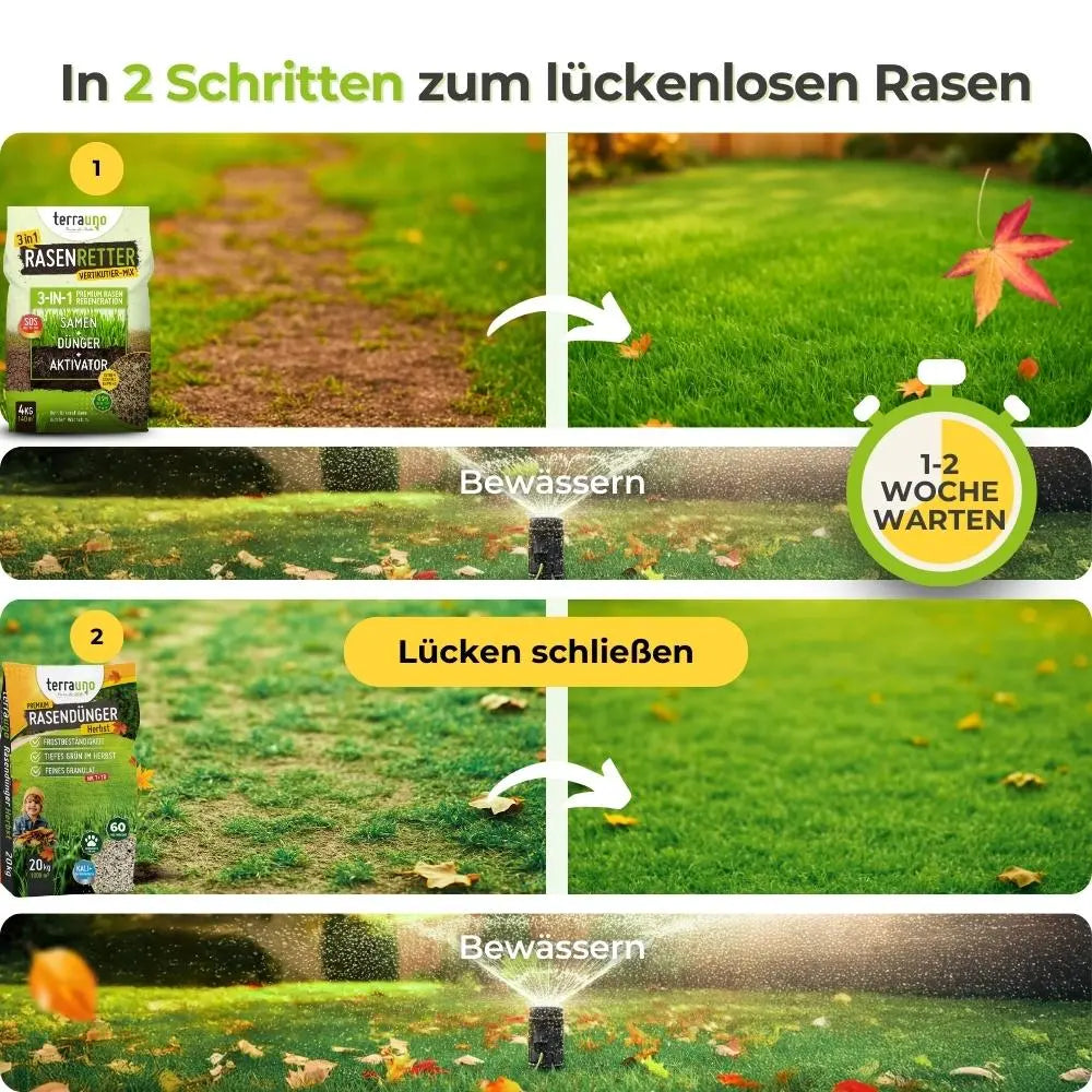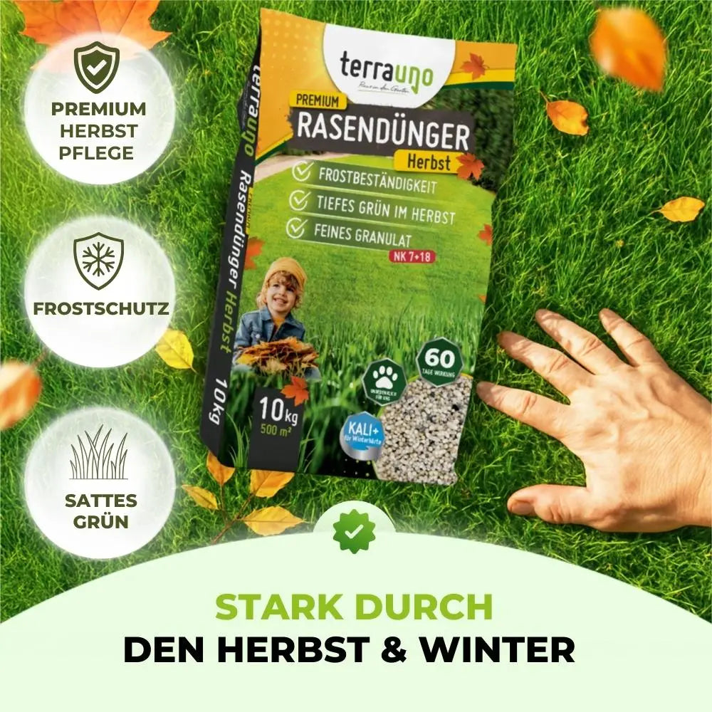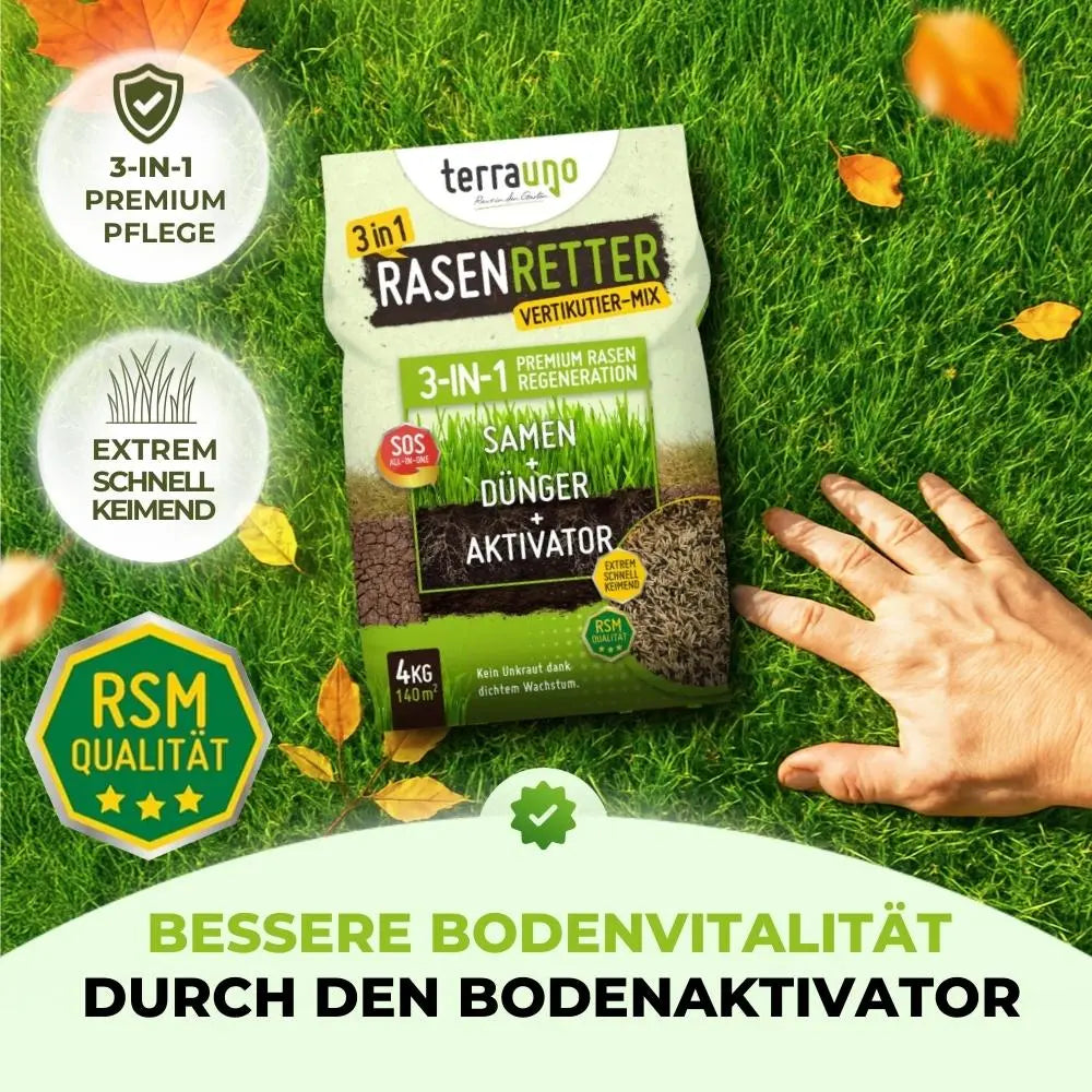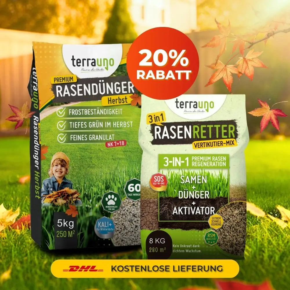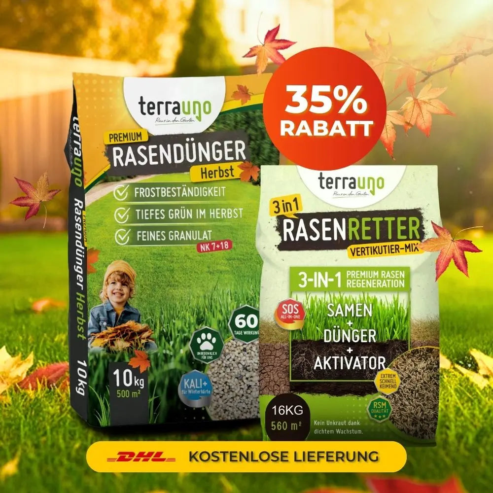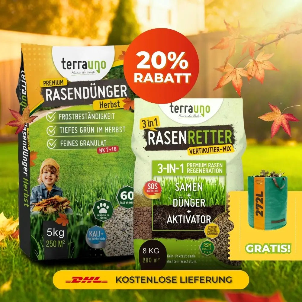 Für die schnelle Erholung nach dem Vertikutieren: Der Vertikutiermix (Samen, Dünger und Bodenaktivator) schließt zuverlässig kahle Stellen und bringt frisches Grün zurück. Im Anschluss stärkt der kaliumbetonte Herbstrasendünger die jungen Gräser und macht deinen Rasen winterfest.