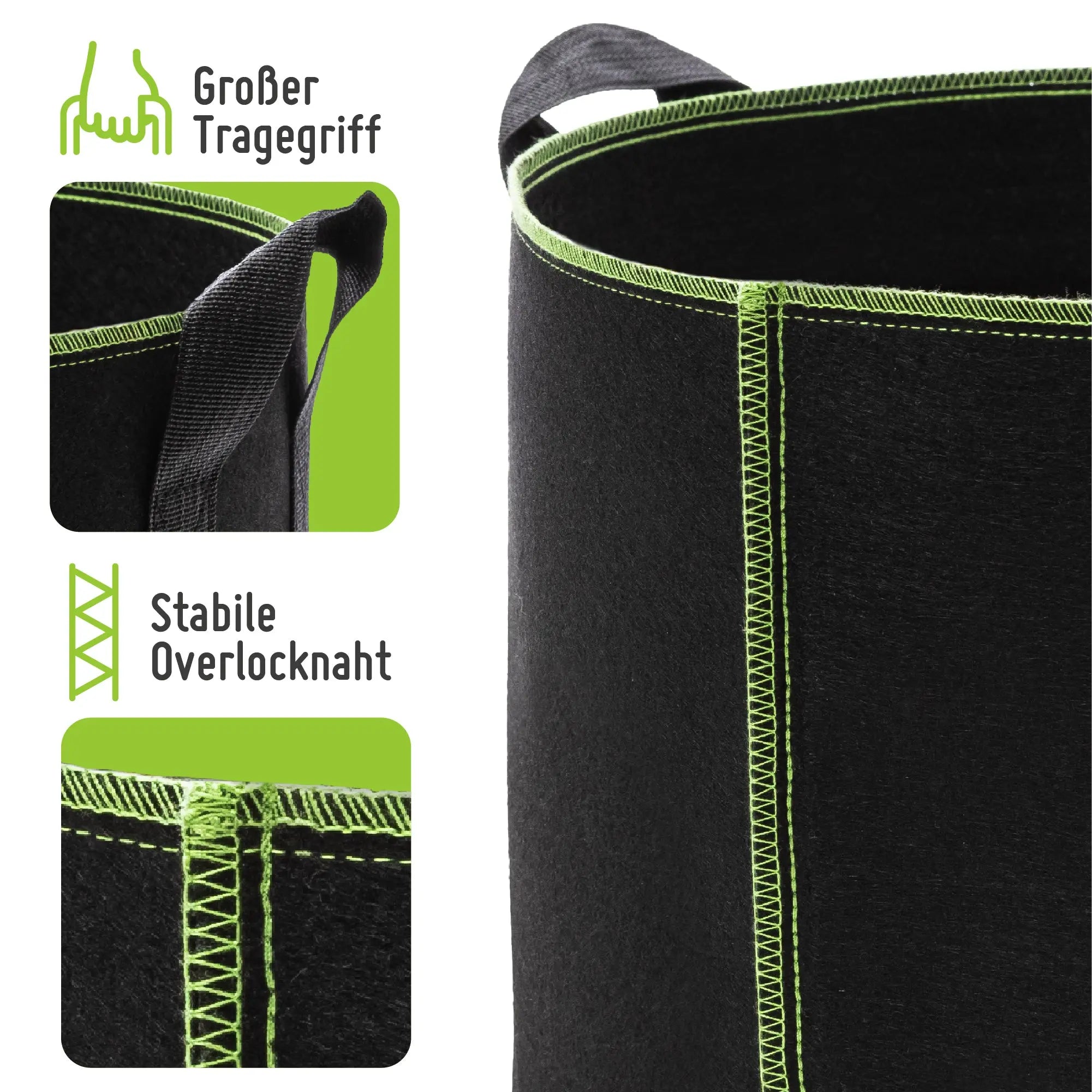 - Material und Design: Der Pflanzsack besteht aus hochwertigem, UV-stabilisiertem Vliesstoff, der langlebig und wiederverwendbar ist. Er fördert eine gesunde Wurzelentwicklung durch seine Atmungsaktivität.