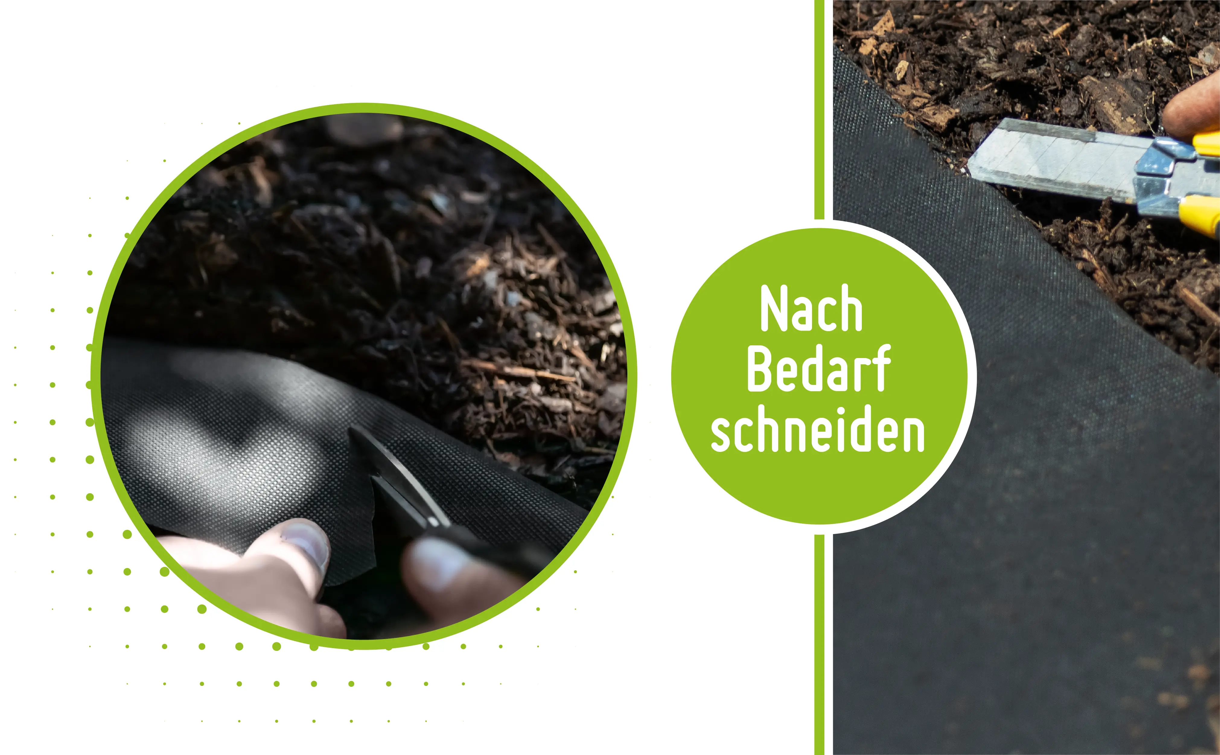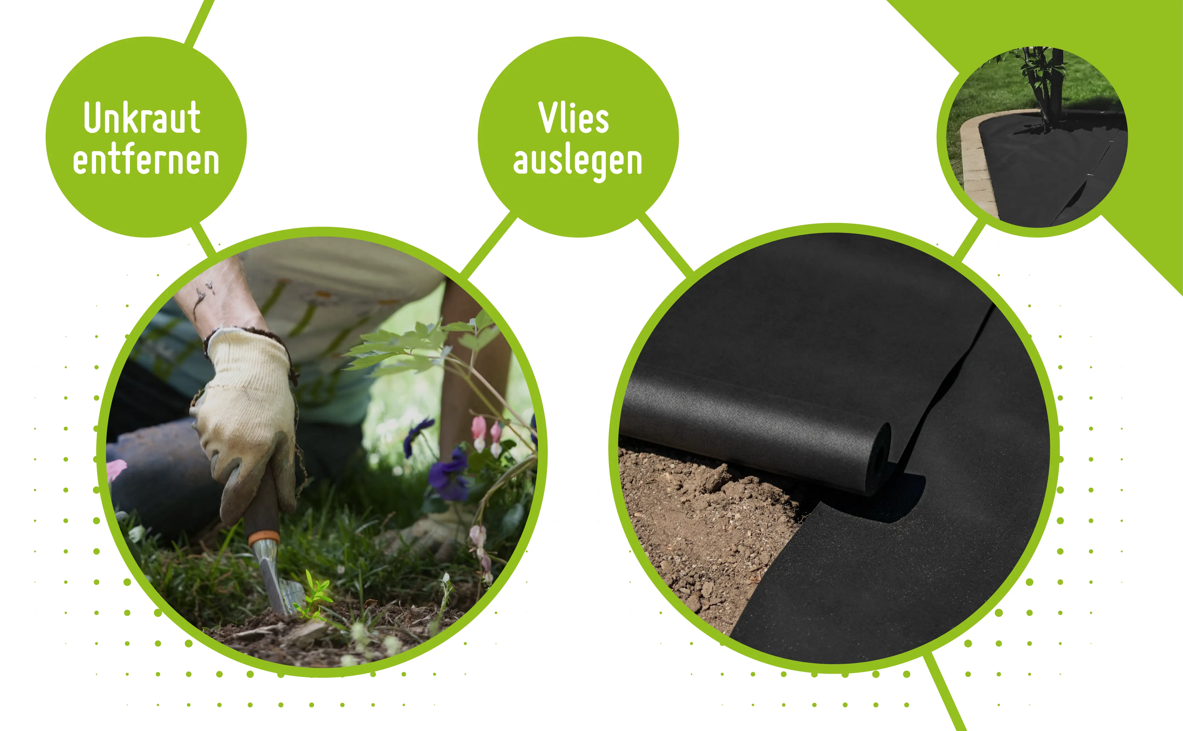 - Einfache Anwendung: Das Unkrautvlies lässt sich leicht zuschneiden und an die gewünschte Fläche anpassen. Es kann einfach mit Erdankern oder Steinen befestigt werden.