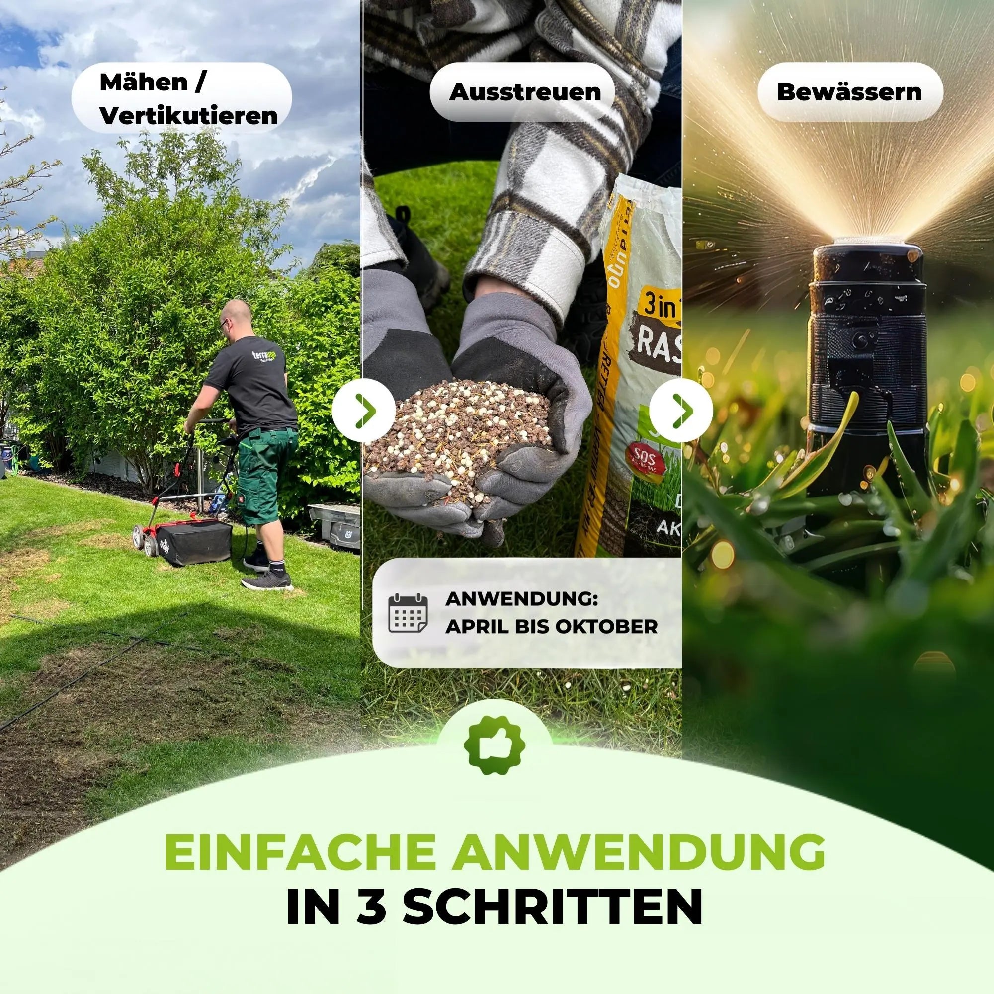 übertrifft herkömmlichen Vertikutier Mix. Selbst stark beschädigte Rasenflächen ohne Graswuchs werden komplett wiederhergestellt. Mit einer einzigartigen Mischung aus hochwertigen Samen, Düngemitteln und Bodenverbesserern repariert es kahle Stellen effektiv, fördert das Wurzelwachstum und schafft einen dichten, gesunden Rasen.