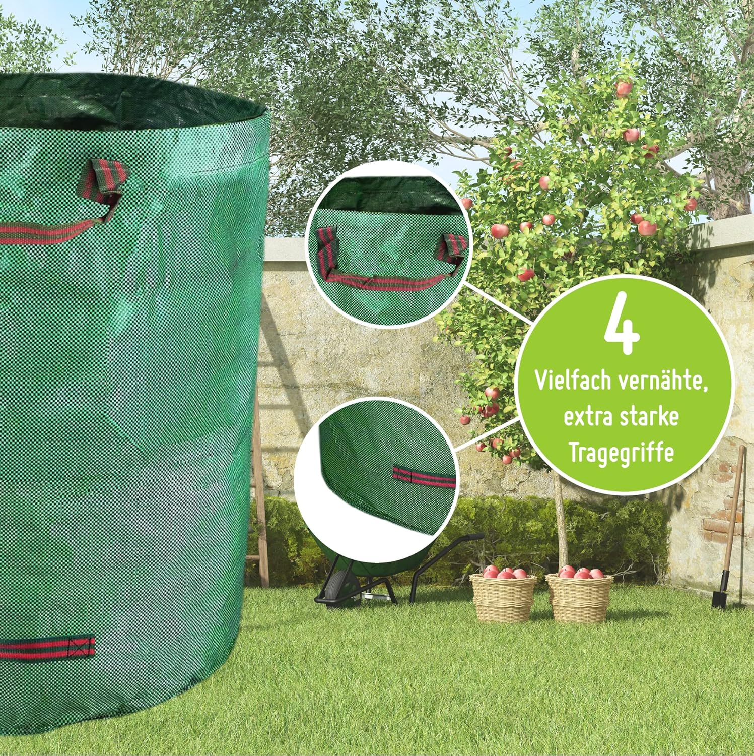 Mit 4 vielfach vernähten und verstärkten Tragegriffen lässt sich der Sack auch in vollem Zustand mühelos transportieren. Die Griffe am Boden erleichtern dabei das Ausleeren des Gartensacks