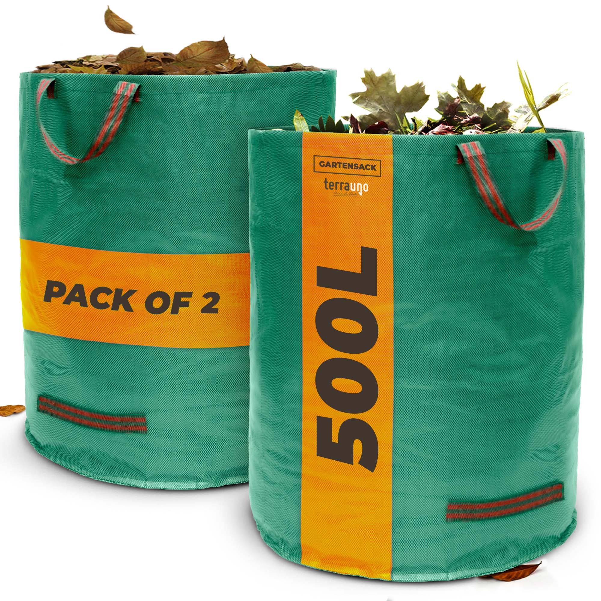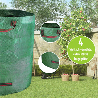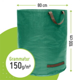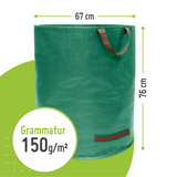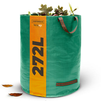 Unsere Gartensäcke sind extra stabil, besonders reißfest dank einer Grammatur von 150g/m². Der verstärkte Boden sorgt für extra Stabilität und hält ohne Probleme einer Belastung bis zu 60 kg bzw 100 kg stand. Die Säcke fassen mühelos 272 Liter bzw. 500l Ihres Grün- oder Rasenschnitts. Zur besseren Lagerung kann der Laubsack im Leerzustand problemlos auf A4 Größe gefaltet werden. Die Gartensäcke sind wetterfest, wasserabweisend & UV-beständig. Somit können sie ohne Probleme auch feuchten Rasenschnitt aufnehmen und sicher transportieren. Mit 4 vielfach vernähten und verstärkten Tragegriffen lässt sich der Sack auch in vollem Zustand mühelos transportieren. Die Griffe am Boden erleichtern dabei das Ausleeren des Gartensacks. Dank mitgeliefertem Verstärkungsring steht der Laubsack auch leer sicher und offen. Das erleichtert Dir das Befüllen unseres Gartensacks