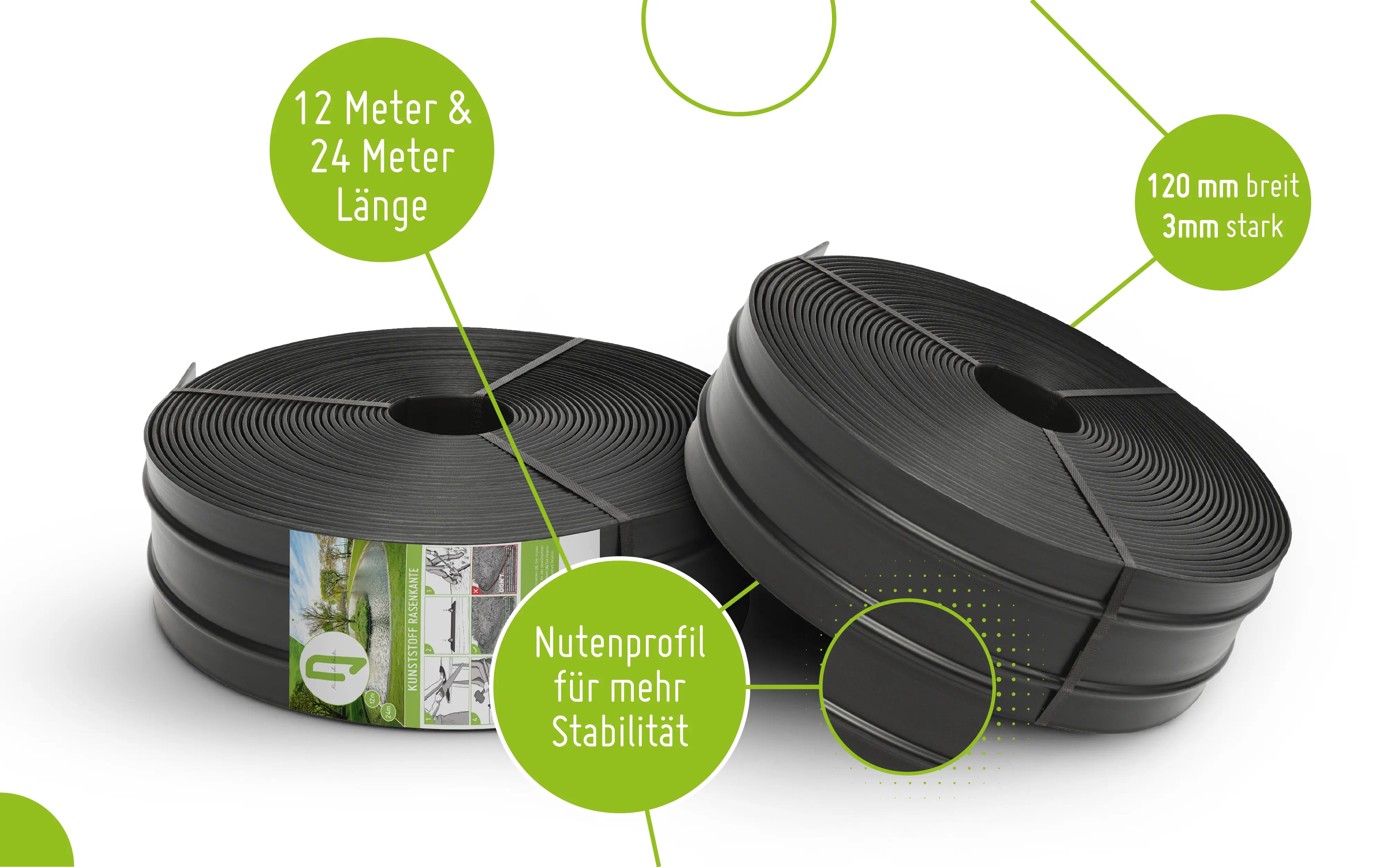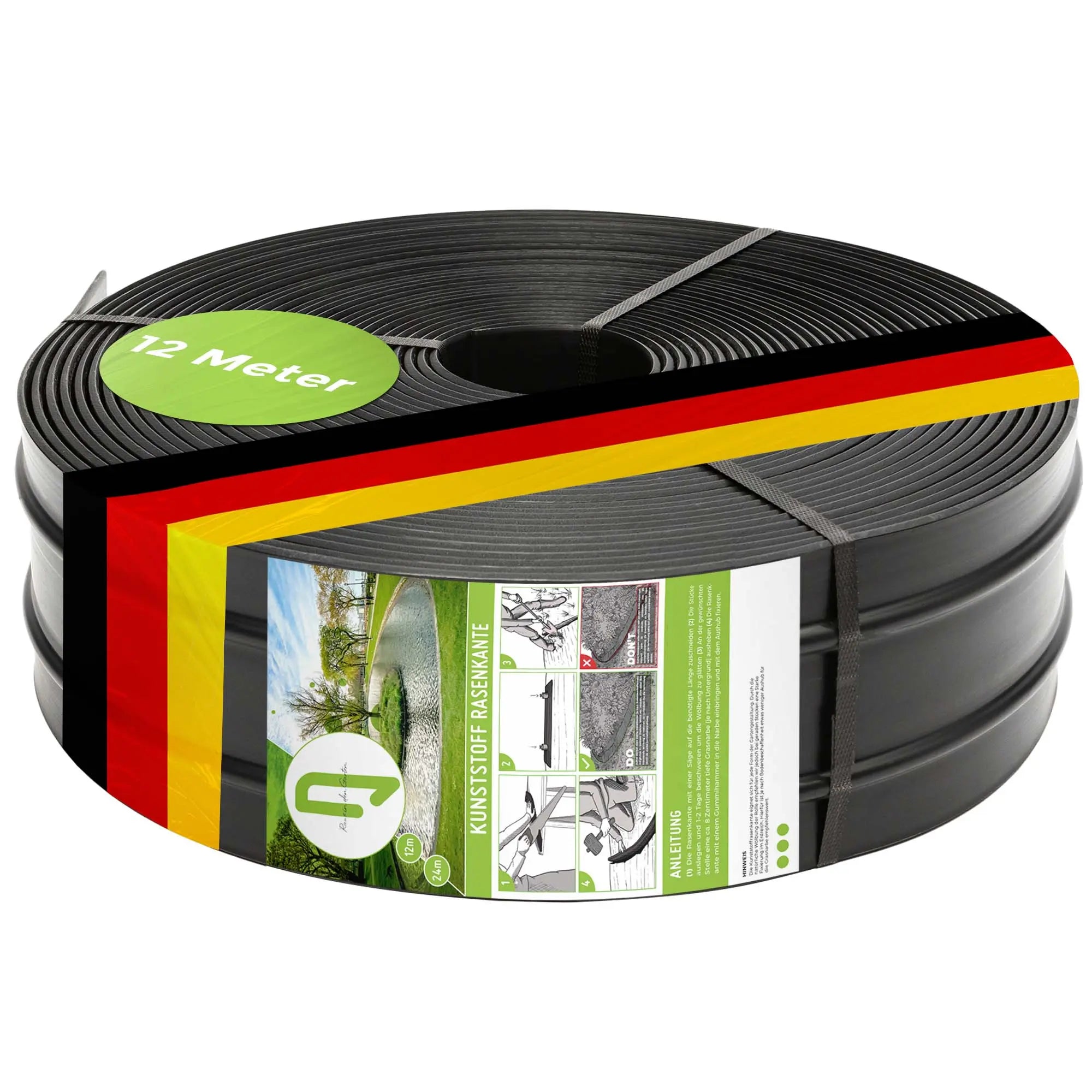 - Abmessungen: Mit einer Gesamtlänge von 12 Metern und einer Breite von 12 Zentimetern (+/- 5mm) bietet die Rasenkante eine ideale Größe für vielseitige Anwendungen im Garten.